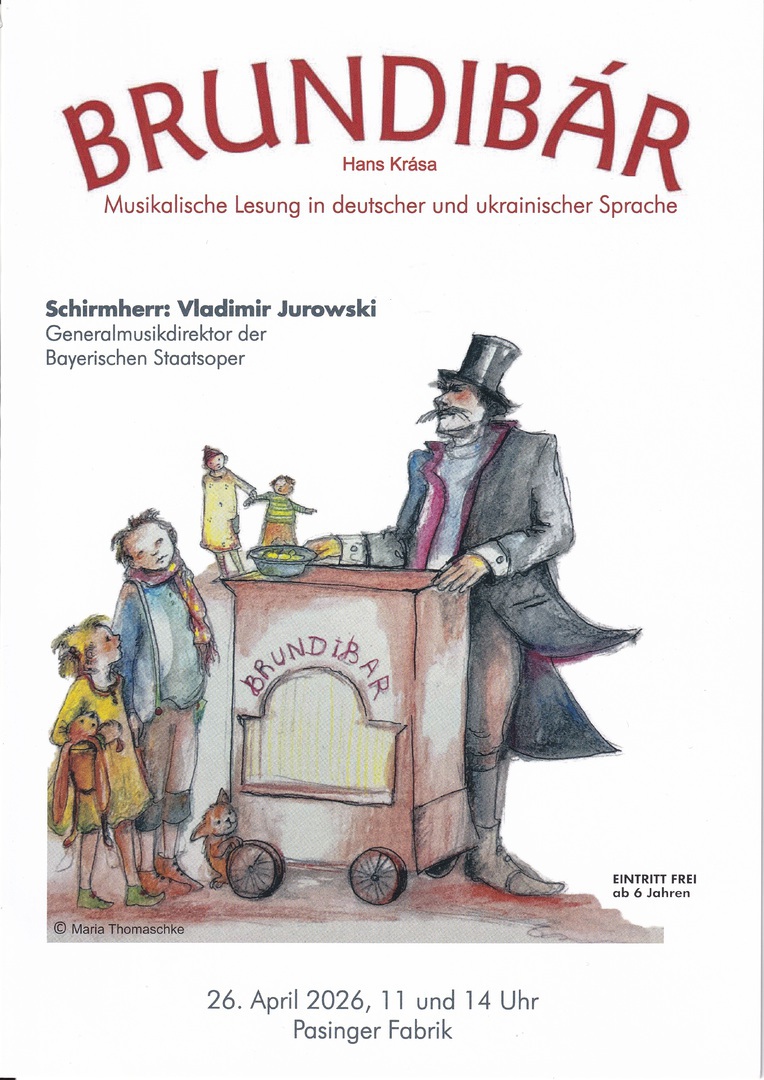 Großartig waren die zwei Brundibár-Veranstaltungen am Sonntag, 26. April 2026 in der Pasinger Fabrik in München, das Publikum hingerissen! Die musikalische Leitung hatte Vladimir Jurowski, Generalmusikdirektor der Bayerischen Staatsoper, der selbst Klavier spielte. Musik wurde neu arrangiert von Richard Whildst, gespielt von einem Ensemble der Staatsoper, darunter unser Mitglied Susanne Gargerle. Es sang ganz wunderbar der Unterstufenchor des Karlsgymnasiums. Die Veranstaltung war mit unserem Brundibár. Lese- und Geschenkprojekt für Kinder verbunden, für das Vladimir Jurowski die Schirmherrschaft übernommen hat.