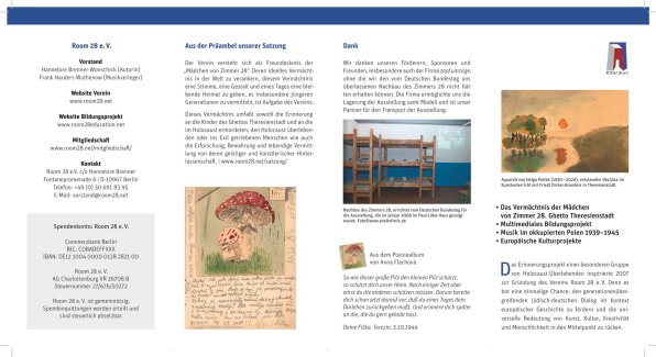 Das Erinnerungsprojekt einer besonderen Gruppe von Holocaust-Überlebenden inspirierte 2007 zur Gründung des Vereins Room 28 e.V. Denn es bot eine einmalige Chance: den generationenübergreifenden jüdisch-deutschen Dialog im Kontext europäischer Geschichte zu fördern, die universelle Bedeutung von Kunst, Kultur und Menschlichkeit in den Mittelpunkt zu rücken und ein außergewöhnliches Kultur-und Bildungsprojekt zu starten.